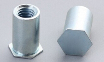 壓鉚螺母柱其外形一端呈六角形,另一端為圓柱狀,六角邊與圓柱狀中間有一道退刀槽,其內(nèi)形為內(nèi)螺紋,通過壓力機(jī)將六角頭壓入薄板的預(yù)置孔內(nèi)(預(yù)置孔的孔徑一般略大于壓鉚螺柱的圓柱外徑)使孔的周邊產(chǎn)生塑性變形,變形部分被擠入壓鉚螺母柱的退刀槽內(nèi),使壓鉚螺母柱鉚緊于薄板上,從而在薄板上形成一下有效固定的內(nèi)螺紋。