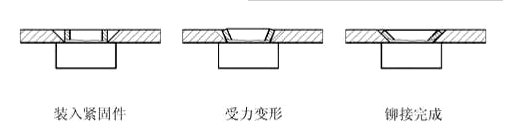 1) 拉鉚是指在鉚接過程中,鉚接件在外界拉力的作用下,發(fā)生塑性變形,其變形的位置通常在專門設(shè)計(jì)的部位,靠變形部位夾緊基材來實(shí)現(xiàn)可靠的連接。常用的拉鉚螺母就是采用此種鉚接型式實(shí)現(xiàn)與基材的連接。