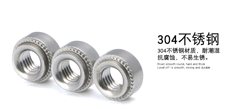 304不銹鋼系列壓鉚螺母、410不銹鋼系列壓鉚螺母,均采用冷鐓工藝?yán)溏叧尚痛笈可a(chǎn), 規(guī)格型號(hào)分別有M3 M4 M5 M6 M8 M12 等,壓鉚螺母全部采用鍍鈦擠牙絲攻牙,螺紋合格率99.5%以上,無爛牙、斜牙現(xiàn)象。 螺盛盾五金科技公司具有豐富的不銹鋼冷鐓經(jīng)驗(yàn),生產(chǎn)效率同比行業(yè)較高。螺盛盾公司生產(chǎn)的不銹鋼壓鉚螺母價(jià)格實(shí)惠,質(zhì)量有保證,最重要交貨快。 常用的不銹鋼壓鉚螺母、碳鋼壓鉚螺母、鍍鋅壓鉚螺母均現(xiàn)貨供應(yīng)。
