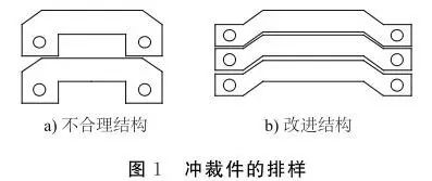 沖裁是利用沖模使板料相互分離的工序。沖裁零件的形狀應力求簡單,盡可能采用圓形或矩形等規(guī)則形狀并簡單對稱,以使下料簡便和排樣時廢料最少(見圖1)。