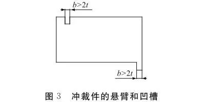 沖裁件上應避免窄長的懸臂和凹槽,以便增大模具相應部位的刃口強度。懸臂和切口的寬度b應大于板厚t的2倍(b>2t)。沖裁件的懸臂和凹槽如圖3所示。