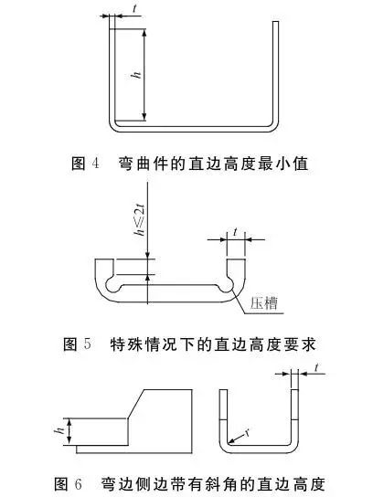折彎件的直邊高度不宜太小,最小高度h應大于2倍的材料厚度t(見圖4)。當零件折彎的直邊高度h≤2t時,可在彎曲變形區(qū)內(nèi)加工淺槽后,再折彎(見圖5)。當折彎件的折彎邊帶有斜角時(見圖6),側面的最小高度h=(2~4)t,且h>3mm。