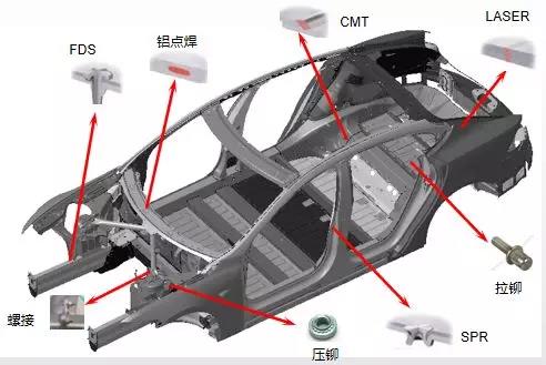 特斯拉Model-S應(yīng)用了鋁點焊、CMT、激光焊、拉鉚、壓鉚、SPR、FDS、螺栓連接、膠結(jié)等工藝,通過這種熱連接技術(shù)與冷連接技術(shù)的組合應(yīng)用,優(yōu)勢互補;實現(xiàn)零件的連接,對控制車身精度及連接強度具有較大意義。