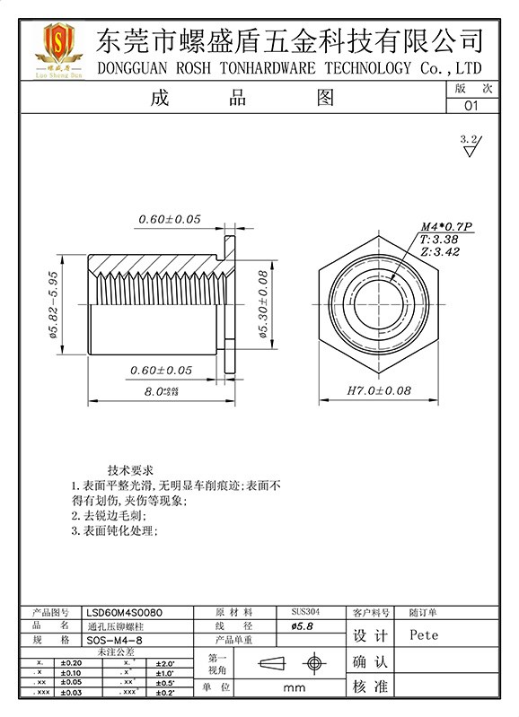 SOS-M4-8 壓鉚螺母柱