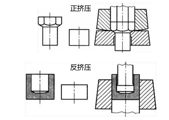 3、反擠壓:坯件在變形中,金屬沿著凹模內(nèi)壁流動,其流動方向與沖模運動方向相反。如內(nèi)六角圓柱頭螺栓,頭部沖孔,為反擠壓。
