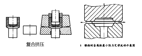 4、復合擠壓:坯件在變形中,金屬沿著凹模內(nèi)壁流動,一部分流動方向與沖模運動方向一致,一部分流動方向與沖模運動方向相反,即既有正擠壓又有反擠壓。如內(nèi)六角圓柱頭螺栓,在同一工位頭部沖孔、桿部縮徑,即為復合擠壓。