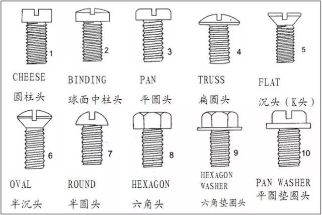 螺絲的頭型厚度與直徑大小一般可以自定義,通常頭部直徑比螺桿單邊大0.6mm以上,以能覆蓋住鎖不穿而定,太小會容易鎖穿。比如M1.4的螺絲,螺絲頭的直徑為2.6mm.塑膠螺孔開孔直徑為1.6,單邊覆蓋0.5mm。隨著產(chǎn)品設(shè)計不同,螺絲規(guī)格變大,設(shè)計參數(shù)也有改變,比如M3.0的螺絲,開孔就要做到3.5以上,那么螺絲頭的直徑就要做到5.0以上才是安全的。設(shè)計參數(shù)要以實(shí)際的產(chǎn)品設(shè)計要求去定義。 下面是幾種常規(guī)螺絲的頭型。