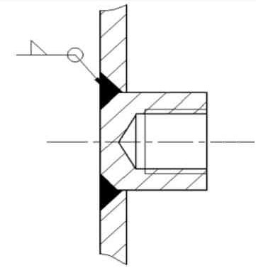 該機箱材質(zhì)為Q235,板厚1.5 mm,主要工序有折彎、焊接、電鍍和噴漆等。由上述分析可知,該零件的壓鉚工序應安排在電鍍工序完成后。而零件電鍍后,已折彎焊接成型,使壓鉚空間受限。針對上述問題,經(jīng)分析研究,加工策略采用焊接工藝,將壓鉚螺柱改為焊接鋼螺柱,可避免壓鉚螺柱被電鍍?nèi)芤焊g;同時由于焊接鋼螺柱與機箱材質(zhì)相同,可在機械加工完成后與箱體一起鍍鋅,螺柱也得到了相應的防銹處理,有效解決了該類鈑金件的螺柱安裝問題。具體加工工藝如下:01用Q235-A棒料,根據(jù)壓鉚螺柱長度和內(nèi)螺紋深度,車削加工出相同尺寸的鋼螺柱,在螺柱一端棱邊倒C1斜角(見圖3);02根據(jù)鋼螺柱外圓,在機箱安裝位置配鉆底孔,并沉孔;03加工機箱外形;04根據(jù)底孔位置,將鋼螺柱焊接在機箱上(見圖4);05機箱外表面焊疤打磨平整;06機箱鍍鋅、噴漆。