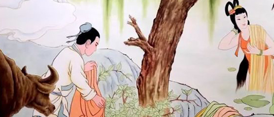 牛郎出身貧寒,年紀不小了, 還是孑然一身。他有一頭老黃牛,一天,老黃牛對他說:“河里有一群姑娘在洗澡,她們把衣服脫在河沿上,有一套白色的衣服,你把它拿走,那件衣服的主人就是你的妻子。”